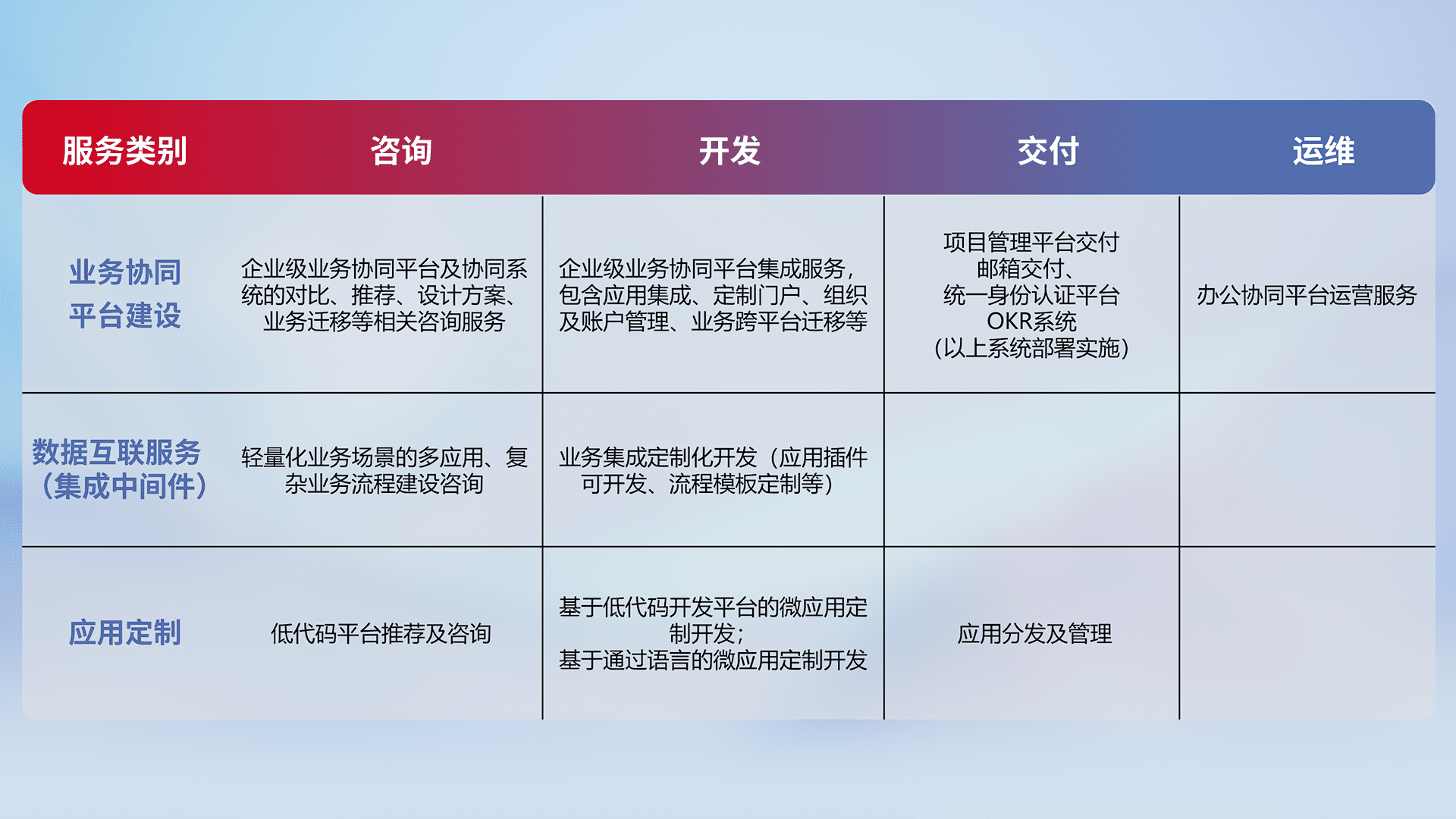 针对钉钉、、、企微、、、IDaas等平台级产品提供产品的规划、、、、方案、、、交付、、、、定制化开发等服务,,实现如统一协同办公、、、智能客户服务、、、、混合会议管理、、、、智能数据查询、、、、等业务场景,,,,实现数字化转型。。。。