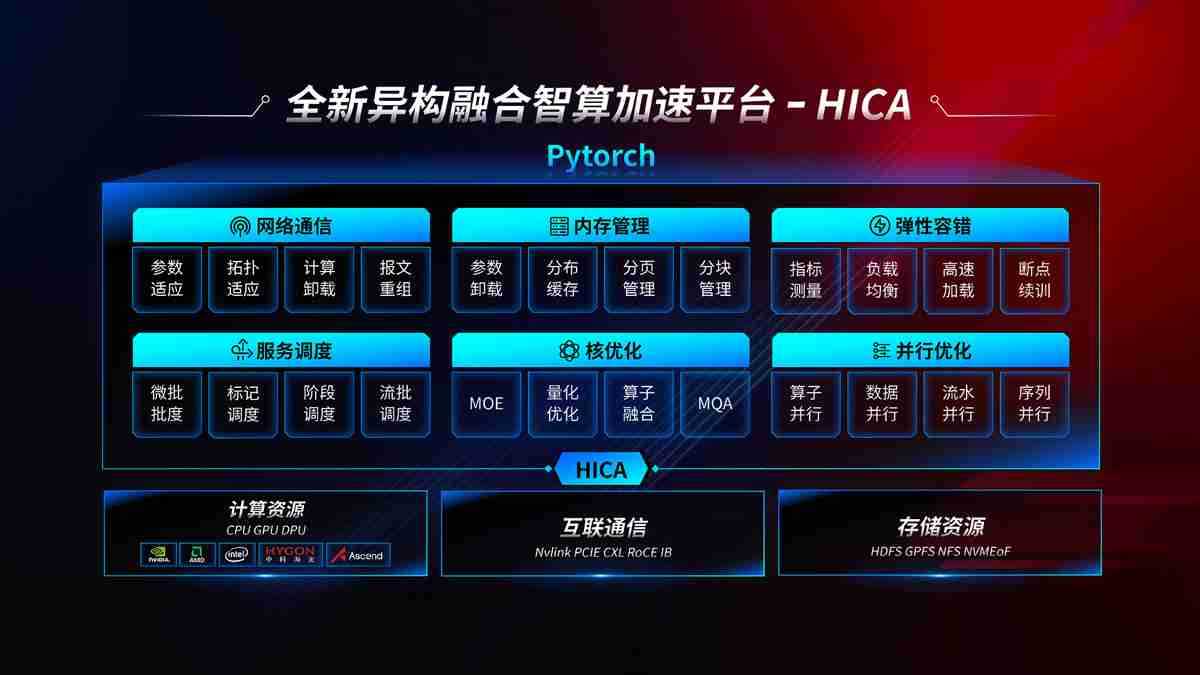 通过自研的服务层、、、中间适配层、、、以及调度编排算法,,,,采用数据并行、、模型并行等多种并行方式,,把并行计算任务进行有效的分解,,使其分别由相应的软件栈和算力资源来承接。。。当GPU资源变化,,HICA可以实时动态调度计算子任务并调整模型拓扑和架构,,,以充分聚合各种算力资源。。。