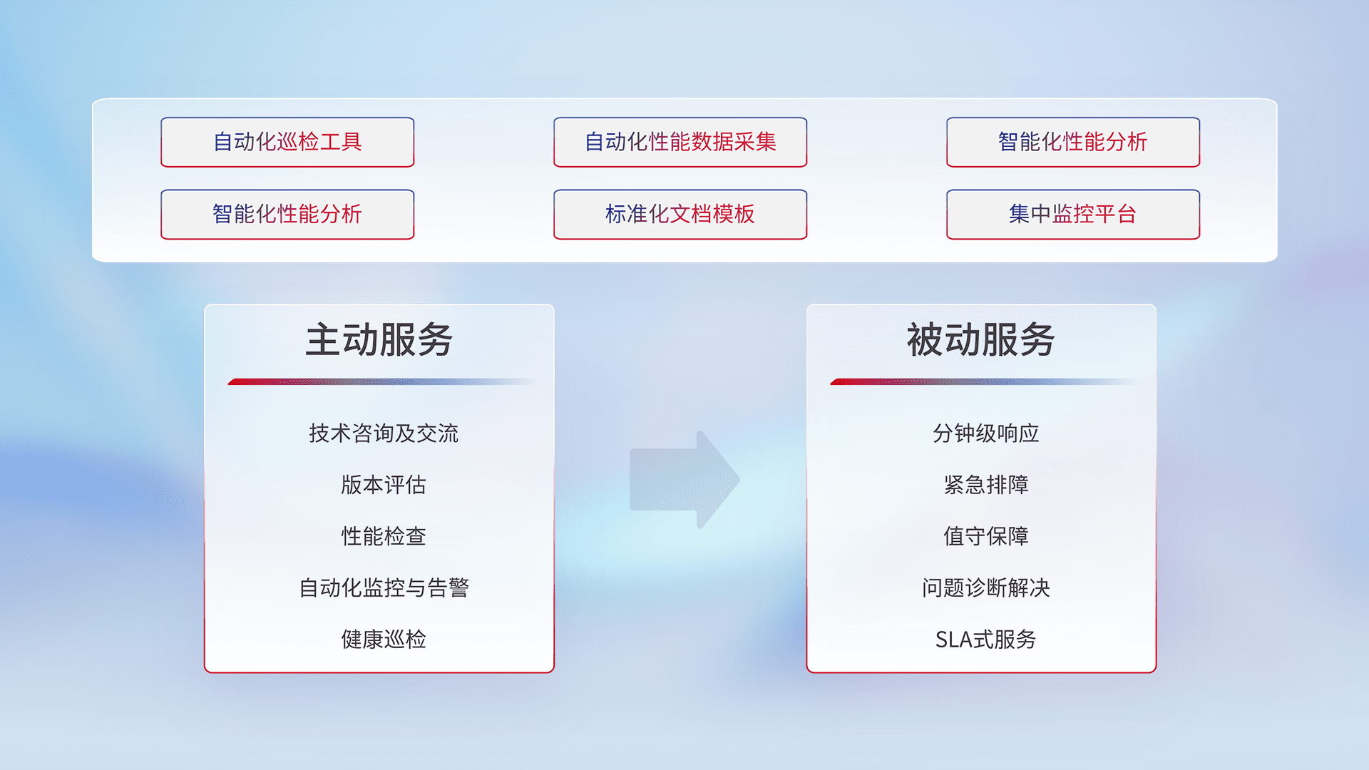 智能化工具和标准化文档,,,,保障服务质量,,,,提供主动服务(包含技术咨询、、、版本评估、、性能检查、、自动化监控与告警、、健康巡检)和被动服务包含(分钟级响应、、紧急排障、、值守保障、、问题诊断解决、、、SLA服务)。。。
